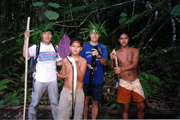 96年タヒチにて。現地の子供がウナギ取りを手伝ってくれた。子供たち手作りのシダの冠をかぶって青山くんと(本人:右から二人目)。