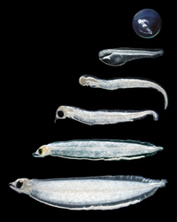 でもこの結果に基づいて、僕らは次の1991年の調査では、航海を夏に計画しました。それまでのウナギ航海は3月とか12月とか、すべて冬場に実施されていたので、これは大冒険でしたが、なんとこれで10mm前後のレプトケファルスを1000匹近く採集できたんです。その中には、これまでの最小サイズ、全長7.7mmの仔魚も含まれていました。大体生まれて2週間前後のものです。