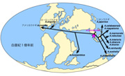 図2 ウナギは今からおよそ1億年前に現在のボルネオ島付近の海産魚を起源として世界中に広がったものと推定された。