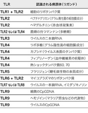 TLR受容体のリガンド一覧。TLRノックアウトマウスをふるいとして利用し、次々にリガンドを見つけていった。