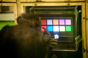 チンパンジーが来るまでの1年間、ニホンザルの赤ん坊を自分で育てる研究をしました。サルがわかったと思い始めていたところに、1977年の秋、チンパンジーのアイがやってきました。その衝撃は大きかった。なんじゃこりゃ、これはサルじゃないぞというものが目の前に現れましたから。最初から目をじっと見てコミュニケーションができたのです。1978年4月15日にチンパンジーに言葉を教える研究、アイプロジェクトが始まりました。アイが初めてコンピュータの画面に触れて言葉の学習を始めたのです。室伏先生の「大型類人猿の人工言語習得とその脳内機構」という研究プロジェクトの一員として、実験を計画してきましたが、言語によるコミュニケーションが可能なことはある程度わかっていたので、もっと科学的な方法でチンパンジーの認識の研究をしようと考えました。言語をメディアとして、チンパンジーが見ている世界を知ろうとしたのです。それまでの研究では、彼らが言語を覚えたり使ったりする行動を言語的に説明していましたが、僕は人間とチンパンジーで同じ装置を使い、同じ測定方法を使って、人間とチンパンジーの知覚や認知の比較研究をすることにしました。比較認知科学というのは、僕がこのアイプロジェクトで初めて使った言葉です。手話研究はすでに行われているので、そうではない方法を考えるべきなのですから。お手本があるわけではないので、日々を積み重ねていく中で、毎日新しいチンパンジーの側面が少しずつわかってきました。まず手がけたのは、色の認識です。チンパンジーがヒトと同じ赤、緑、青の三原色をとらえていることは、生理的なレベルではわかっていましたが、どう見えているのかはチンパンジーに聞いてみるしかないわけでしょ。使ったのは図形文字で、色に相当する文字と色の組み合わせを教えました。赤い色紙を見せて、赤という文字を選べば正解です。こうしてアイは、十一色の色とそれを表す図形文字を選べるようになりました。同じことを大学院生にもやってもらいます。二百種類以上の色を見せて、何色に見えるかを聞く実験では、青緑のような境界の色でヒトもチンパンジーも同じように迷います。その結果を比べるとチンパンジーとヒトと色の認識が、ほぼ同じことがわかりました。これは日本人が日本語で表す色の見え方ですが、バーリンブレント・バーリン米国ジョージア大学の文化人類学者。