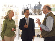 グドール博士(左)、マルチネス博士と。背景は伊谷純一郎先生のフィールドノートの展示。
