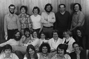 当時のアドラー研究室のメンバー。後列の右から2人目がアドラー教授、左から2人目は新井孝夫さん(東京理科大学名誉教授)。研究室では発想力が競われ、緊張感をもってこの時期を過ごした。(写真は帰国後に送ってもらったもので、本人は写っていない)