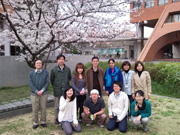 春には、研究室のメンバーと恒例の花見。(2010年。本人:後列の左端)