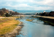 ERATOプログラムで、10万匹メダカを飼育した鴨川沿いの近畿地方発明センター。(右奥の白い建物)