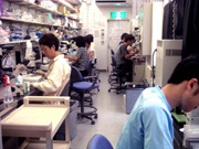 京都大学大学院の頃、小関研究室の実験台で。この頃は、大腸菌の鞭毛の形成を研究した。実験台の向かいには、小関先生の実験スペースがあった。