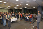 仲村春和さん(中央)が中心となって開催した国際鳥類学会(International Chick Meeting)。約250人の出席者のうち6割は外国からの研究者だった。(2012年、名古屋。本人:壇上で挨拶)