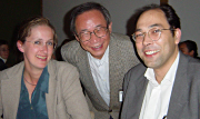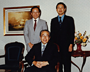 1985年、私は日本生化学会奨励賞を、PGJ2のテーマで共同研究者であった福島雅典博士(後列右、当時・愛知県がんセンター)は日本癌学会奨励賞を受賞した。感謝の意を込めて両者の恩師、早石先生(前列)をご招待して食事会をもった。(本人:後列左)
