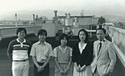 早石先生の御退官後、独立して小さなグループをつくって活動した。私はこの時期を隙間時代と呼んでいる。1985年医学部の旧医化学薬理学棟の屋上で。一番左は私が最初に受け持った大学院生の大心池俊哉君(故人)、その右は横出正之くん。(本人:右端、英国時代のなごりでパイプをくわえている)