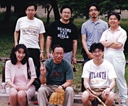 薬理学第2講座は医学部の第1講座の真崎研、医化学教室の月田研、本庶研と一緒にA棟にあり、春には教室対抗のソフトボール大会が行なわれた。(本人:前列中央)垣塚くん(後列右端)の活躍に拘らず、優勝はできなかったが、リフレッシュできる楽しいひとときだった。その右、竹林浩秀くん(現・新潟大学)。後列左から2番目、小林拓也くん(現・京都大学)、山口正洋くん(現・東京大学)。