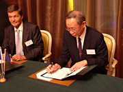 京大医学部長在職時、京都大学でのフランス国立保健医学研究所(INSERM)研究ユニット設置の調印式。2007年2月8日、パリのフランス学士院で。左はINSERM長官のChristian Brechot博士。
