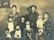 幼少のころ、家族に叔母や従妹を交えて撮った写真。母(右端)は女手一つで8人の子供たちを空襲から守り抜き、戦後の貧しい生活の中で子供たちを育て上げた(本人:左端)。