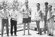 日本、アメリカ、仏領ポリネシアの共同研究では、シガテラ研究の先駆者たちが揃った。リーダーのハワイ大学バナー先生(Albert H. Banner:中央)、シガトキシンの命名者ショイヤー先生(Paul J. Scheuer:右端)、橋本先生(左から二番目)、タヒチのルイ・マラルデ医学研究所のバグニスさん(Raymond Bagnis:右から二番目)。