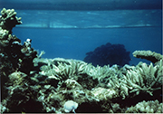 ガンビエル諸島の海底。白いサンゴの死骸が辺り一帯を覆っていた。死サンゴの表面に石灰藻が生育し、G. toxicusの繁殖しやすい条件が整っていた。