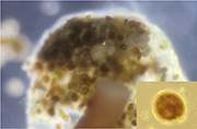 石灰藻の表面を覆い尽くすG. toxicusとその拡大図(右下)。渦鞭毛藻のG. toxicusは大型の海藻に付着して生育するが、海藻から遊離して泳ぐこともある。