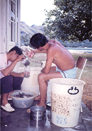 サンゴからかき落とした藻類の混合物から、数種のふるいを使ってG. toxicusをふるい分ける、井上晃男教授(左)とレイモンド・バグニス博士(右)。