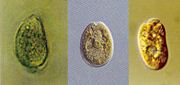 G. toxicusに近縁な底性渦鞭毛藻Ostreopsis siamensis(左)や、Prorocentrum lima(中央)も、魚介類中毒の原因物質を生産していることを発見した。赤潮の原因となるAmphidinium klebsii(右)からは、強力な抗カビ成分を発見した。