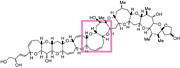 シガトキシンの化学構造。たくさんの環が連なった形は「はしご型」構造と呼ばれる、海洋生物の化合物に特有の構造。分子中央の9員環と7員環(枠内)は、配座交換によって立体構造を変化させ、ちょうつがいのように分子を折り曲げる。近年、この柔軟な構造が毒性の発現に深く関わっていることが分かってきた。