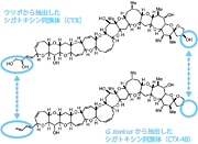 G. toxicusとウツボから抽出されたシガトキシンの構造を比べると、ウツボのシガトキシンは分子の両端が酸化されている(枠内)。なぜウツボがシガトキシンの毒性を強めて蓄えるのかは解明中だが、フグのように積極的に毒を防御などに利用する兆候は見られていない。