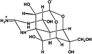 フグ毒成分テトロドトキシン(TTX)の立体化学構造。小さな分子だが、非常に複雑な立体構造をしている。