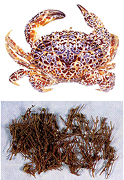 フグ毒の謎を解く材料となったウモレオウギガニと、その餌となる石灰藻のヒメモサズキ。調べてみると両方からTTXが検出された。
