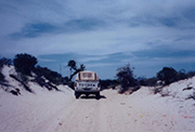 四輪駆動車でマダガスカルの砂漠を横断し、ウミガメ中毒の現場に向かうところ。