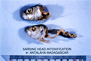 フィリピンやフィジーでよく見られるのはイワシ中毒です。イワシを一匹食べ終わらず、まだ尾が口の外に出ている間にもう症状が出るといわれるくらいの強烈な中毒です。さまざまな集落で聞き取り調査をしてきましたが、子どもが釣ってきたイワシを家族で食べて、一番大きいのを食べたお父さんが亡くなったという話や、飼っていたニワトリや猫がイワシの食べ残しを食べてすぐに死んでしまい、中毒だと気付いて吐き出したがもう手遅れだったというような話が各地にあります。原因はずっと不明でしたが、ある村でイワシ中毒が起きたのとほぼ同時に、隣の村でカニ中毒が起こったのを目の当たりにしたとき、はたと気付いたのです。カニに蓄積されているパリトキシンという毒物質は、イワシ中毒とそっくりな中毒症状を起こすことがあります。底性渦鞭毛藻の一種がパリトキシンを作ることはシガテラ研究のときに確認していましたから、イワシも海底の渦鞭毛藻からパリトキシンを取り込んでいるのかもしれません。中毒患者の食べ残した、たった1個のイワシの頭をマダガスカル・パスツール研究所で手に入れて、祈るようにして分析し、予想通りパリトキシンを検出することができた時は嬉しかったですね。