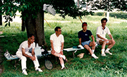 テニスの合間に一休み。東北大学の共同研究者たちはテニス仲間でもあった。大類洋教授(左から二番目)、宮沢陽夫教授(右から二番目)、大島泰克教授(現・東北大学生命科学研究科教授:右端)。(本人:左端)