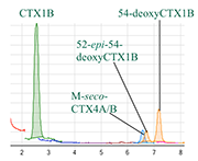 LC-MS/MS(質量分析計の一種)で、シガトキシンの同族体を一挙に検出できる手法を開発した。グラフの一つ一つのピークが、異なるシガトキシン同族体に対応する。