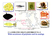 )を開発してくれたりと、新しい技術のおかげで、たった5μg以下の試料で副成分23種全ての構造を、立体構造まで含めて明らかにできました。例えばドクウツボのシガトキシンは、ウツボ体内で酸化されることによって、G. toxicusにあるシガトキシン同族体と比べて毒性が約10倍も高くなっていたのです。ドクウツボは、通常ならすぐ体外に排出される強い毒を蓄積していても、自身は中毒しないようなのです。G. toxicusから出発したシガトキシンが、食物連鎖を通じて多様に形を変えて生態系をめぐっていることが見えてきました。シガテラとの出会いからおよそ40年の歳月を経て、ついにその全体像が明らかになったのです。