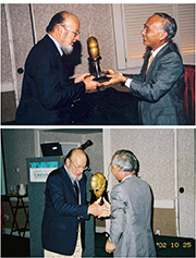 「Yasumoto lifetime achievement award」の授賞式では、渦鞭毛藻をかたどった木製のトロフィーが授与される。2002年の受賞者スメイダ教授(左)は、赤潮に代表される、藻類のブルーム現象(大量発生)の原因や生態系への影響を明らかにした(本人:右)。