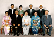 大人になった兄妹8人で母(前列中央)を囲んで。兄妹の中には建築家になった者、政治家の妻になった者や染織研究者になった者もいる。旅が好きで芸術を愛する点は全員に共通していて、これも母の遺伝だと思っている(本人:後列右から二番目)。