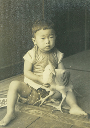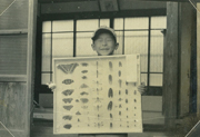 小学1年生のころ、自作の昆虫標本をもって。このアルバムの欄外には母の字で「幼稚園から昆虫図鑑とニラメッコ。天皇陛下の昆虫展が玉屋で開かれ連れて行くと、半日その場を離れなかった。」とある。