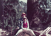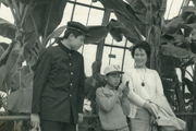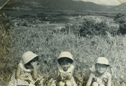 高学年のころ、家族で福岡市内の香椎花園に行った時。小学校に入ってから植物にも興味を持ち始めた。アルバムの欄外には「豆博士。植物辞典でカタカナもすぐ覚える。」と、母のメモがある。(本人:中央)
