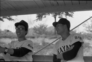 久世球場(岡山県真庭市)で同級生の陶山文三さん(右)と。厳しいチームで6年間続けられたのは、助けてくれる仲間がいたからだ。
