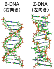 アクチンの研究は、がんの原因を探る道にはつながらなかったのですが、その後、予想外の方向に展開していきました。私はクローニングしたアクチンの塩基配列の中にTとGをくり返す不思議な配列があることに気がついたのです。調べてみるとMITの高名な生物物理学者アレクサンダー・リッチ(Alexander Rich)博士が「Z-DNA」(図2)と名づけた、通常とは逆向きの左巻きの構造をとる配列だとわかりました。試験管の中の合成DNAで発見された構造を、生きた細胞の中に見出したのです。これは重要な発見だと興奮しました。大勢の人が同じゴールを目指す熾烈ながん研究の様相に圧倒され、私は面白い生物学的現象を見出すことで個性が出せる研究をしたいと思っていたので、目の前の現象から何か糸口を掴みたいと必死で考えました。