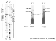 図3:Oct3/4を発見した時の実験結果。カナダで見つけたエンハンサー領域を手がかりに、核酸とタンパク質の結合を調べる実験系ゲルシフトアッセイを行い、未分化性を維持する転写因子を見出した。Okamoto K, Okazawa H et al., Cell. 1990 Feb 9;60(3):461-72.より引用。