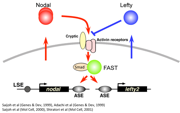 図4:アクセル役のNodalとブレーキ役のLeftyが互いに調節し合いわずかな時間だけ一気に発現が活性化する。