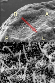 図5:(上)胚の腹側表面にできるノード(下)ノードを構成する数百の細胞に1本ずつ繊毛が生えている。