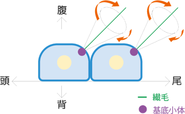 そこで、繊毛の傾きが揃う過程を橋本昌和さん(現・大阪大学助教)らと追いました。注目したのは、繊毛の根元にある細胞小器官、基底小体です。ノード内にある細胞の基底小体の位置は、最初は細胞ごとにバラバラです。ところが、発生が進んでいくと次第にすべての細胞で尾側に移動していくのです。先に決定している背腹、頭尾軸を活用して、数百本の繊毛の位置と傾きが揃うと自ずと回転が始まり、左右の対称性が瞬時に破られるのです。なんとよくできたしくみだろうと、知れば知るほど感心します。実は、ノードという構造自体も1日くらいで消えてしまう一過性のものなのですよ。