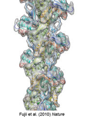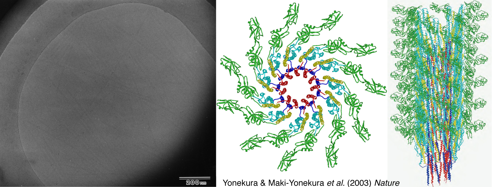 図10:べん毛繊維の電顕写真(左)と解析して得られた原子モデル(右)。多くの写真を重ね合わせることで、埋もれていた情報を引き出すことができる。Yonekura & Maki-Yonekura et al. (2003) Natureより引用