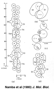 図2:大学院時代のX線による構造解析で見えた、アクチン繊維の構造とミオシン頭部の結合パターン。Namba et al (1980) J. Mol. Biol. より引用。
