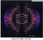 図3:TMV配向液晶試料のX線繊維回折像。Namba et al. (1989) J. Mol. Biol. より引用