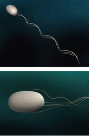 図5:数本のべん毛を束にして回転させて泳ぐ細菌(CG)