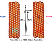 図8:周期長のわずかに異なる2つの型のべん毛素繊維からなる、L型(左)とR型(右)の直線型べん毛繊維構造。Yamashita et al. (1998) Nature Struct. Biol. より引用