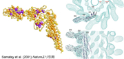 図9:X線結晶構造解析よって得られたフラジェリン原子モデル(左)。クライオ電子顕微鏡の画像解析結果に原子モデルがぴったりとおさまった(右)。Samatey et al. (2001) Natureより引用