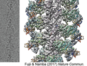 図14:ミオシン頭部の結合したアクチン繊維の電顕写真(左)と解析して得られた原子モデル(右)。Fujii & Namba (2017) Nature Commun. より引用