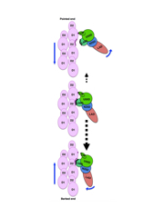 図15:熱ゆらぎによるミオシン頭部の解離の方向を決める弱結合状態の非対称な結合様式。上方向には結合がはずれやすく、下方向にははずれにくいため、熱ゆらぎのフラフラとしたランダムな運動をうまく一方向に偏らせて動く。(薄紫色がアクチン、多色がミオシン頭部)