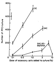 樹状細胞に抗原提示の能力があることを示したデータ。T細胞とB細胞からなる培地に3通りの組み合わせで細胞を添加した場合の、添加量と抗体産生量の相関関係を示す。上:樹状細胞のみを加えた場合、中:樹状細胞とマクロファージが混ざった脾臓の付着性細胞を加えた場合、下:脾臓の付着性細胞から樹状細胞を除き、マクロファージのみを加えた場合。樹状細胞の数と抗体産生応答には高い量的相関が見られる一方、マクロファージのみでは抗体産生を誘導することができないことが分かる。(Inaba K, Steinman RM, Van Voorhis WC, Muramatsu S. 1983, PNAS, Vol. 80 (19), 6041-6045, Fig. 2より引用。)