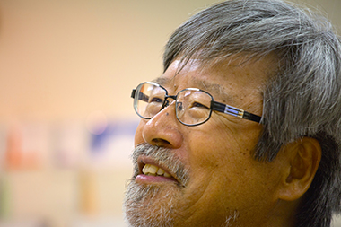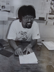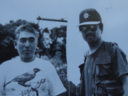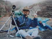 八丈島の民宿の主人、小崎保さんと。鳥島へ向かうときはいつも八丈島を経由しており、79年から毎年同じ民宿を利用している。